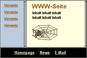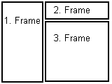 <frameset cols="40%,60%"> <frame src="verweise.htm" name="LinkesFenster"> <frameset rows="20%,80%"> <frame src="titel.htm" name="HauptFenster"> <frame src="control.htm" name="UnteresFenster"> </frameset> </frameset> |